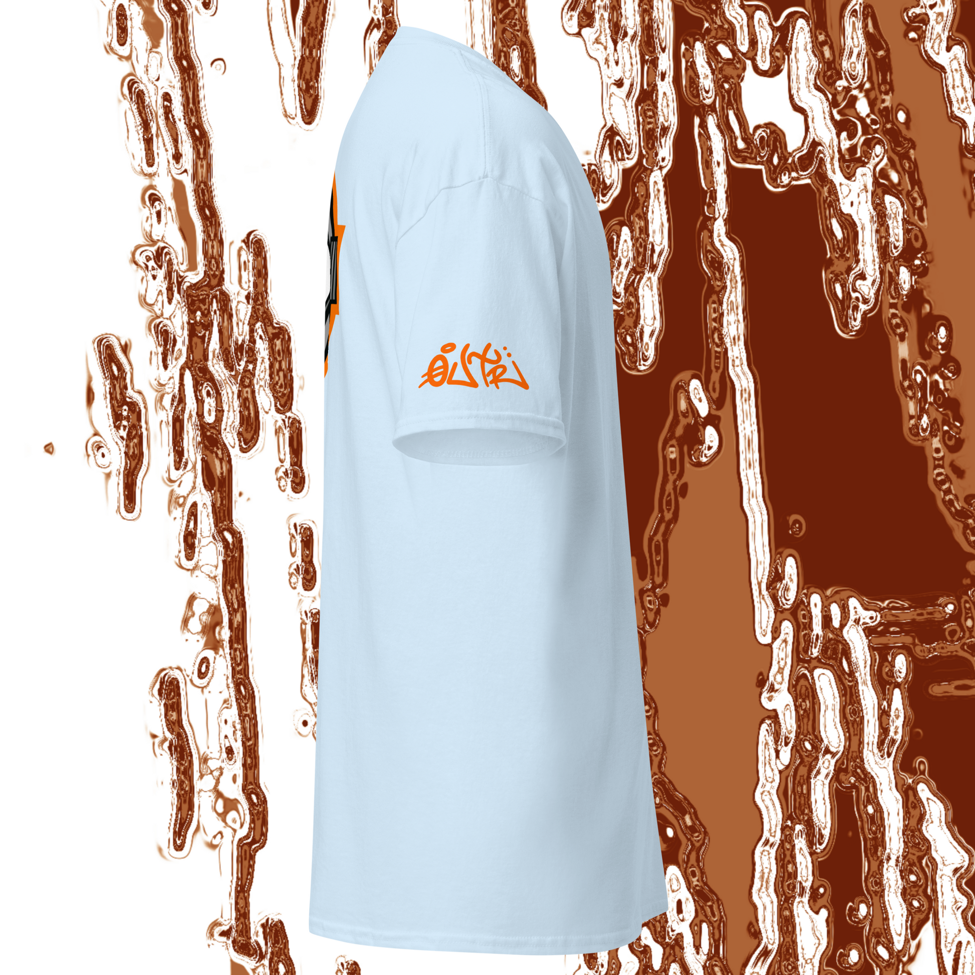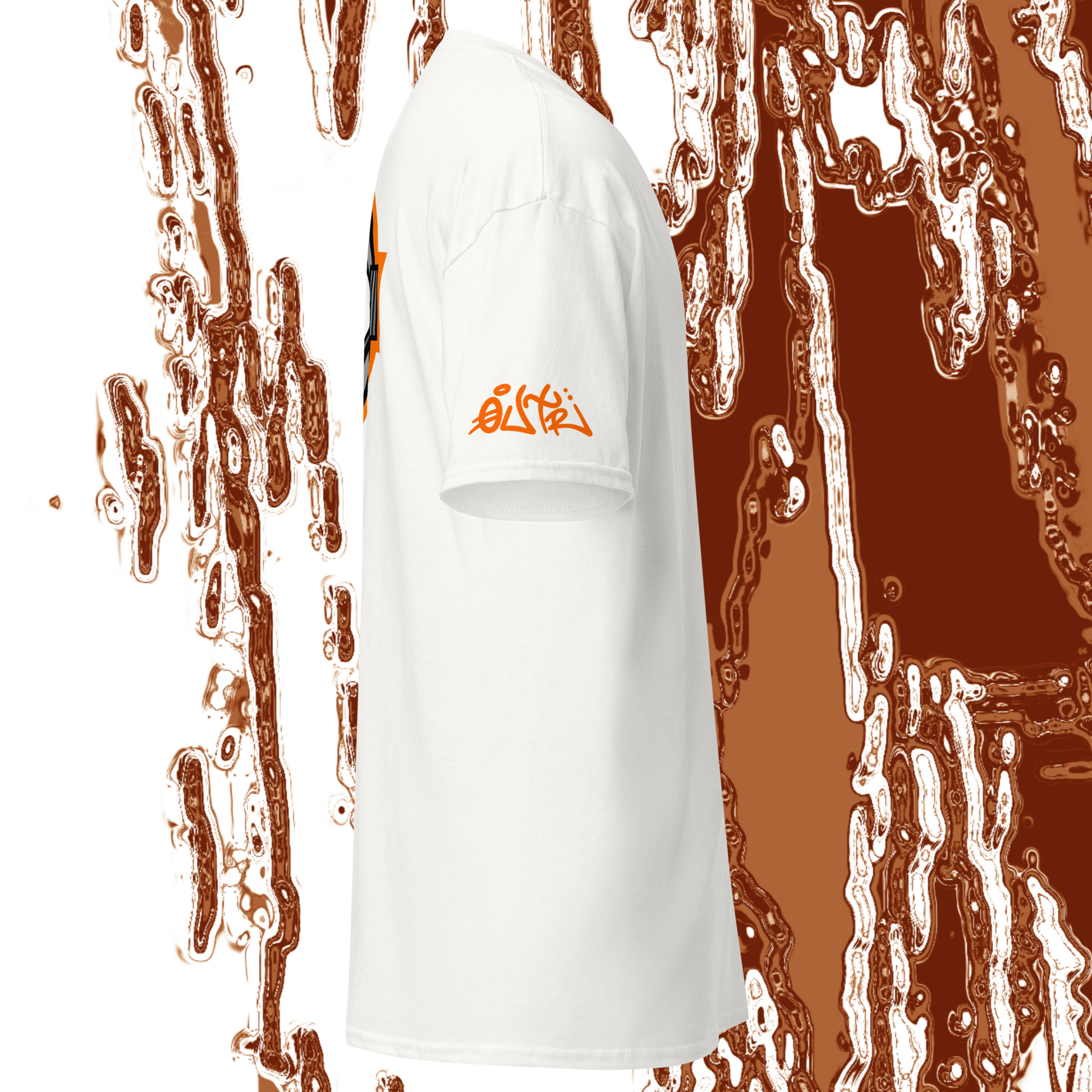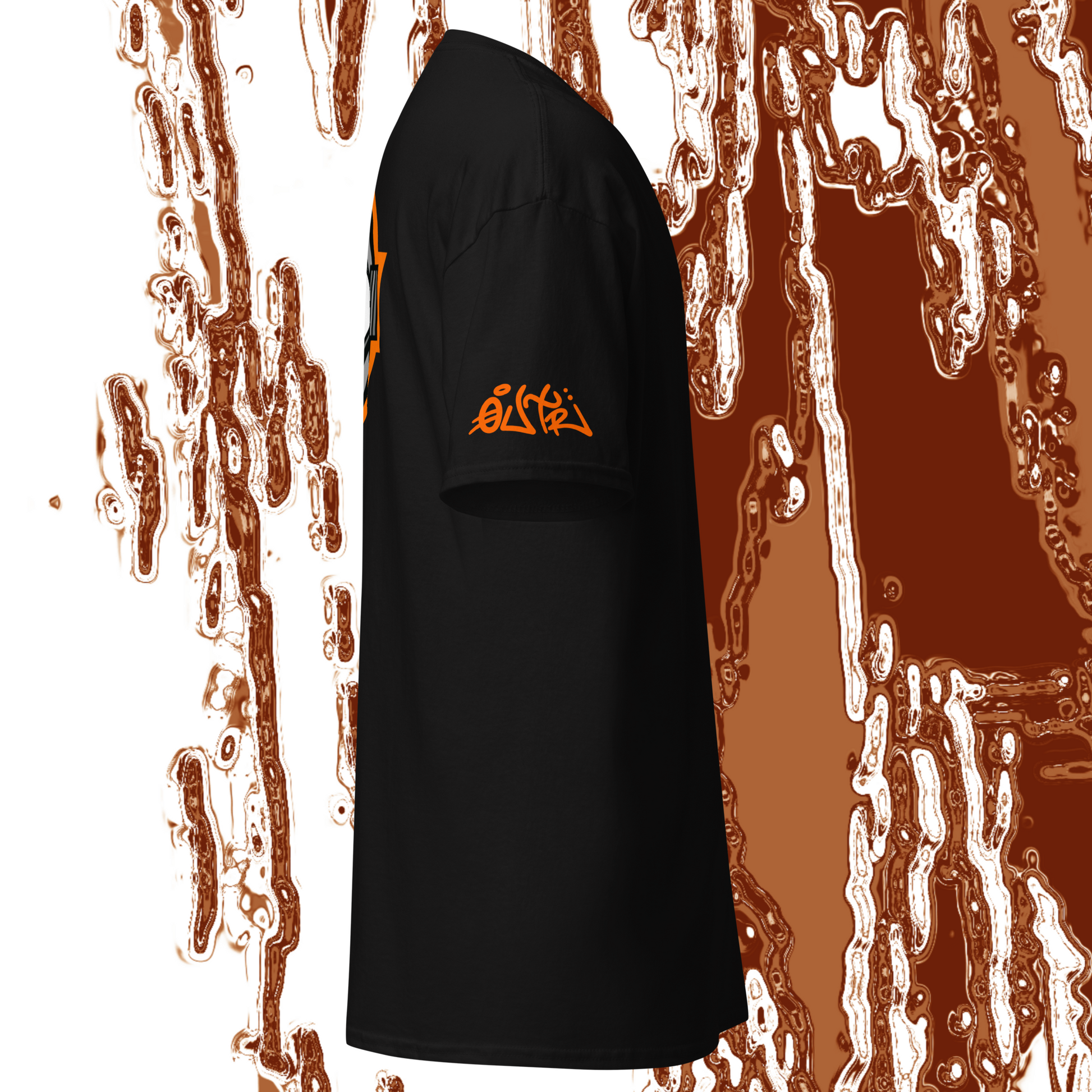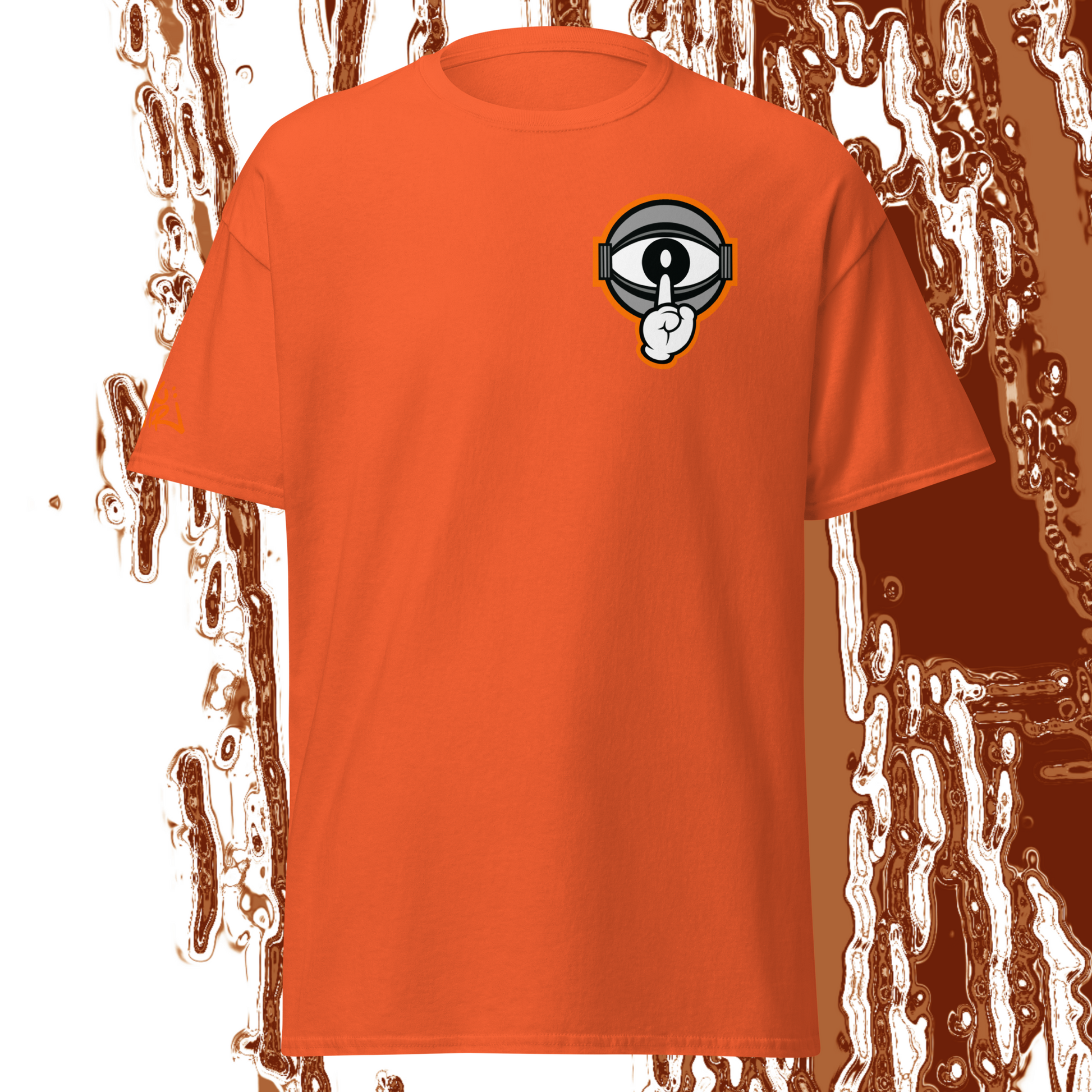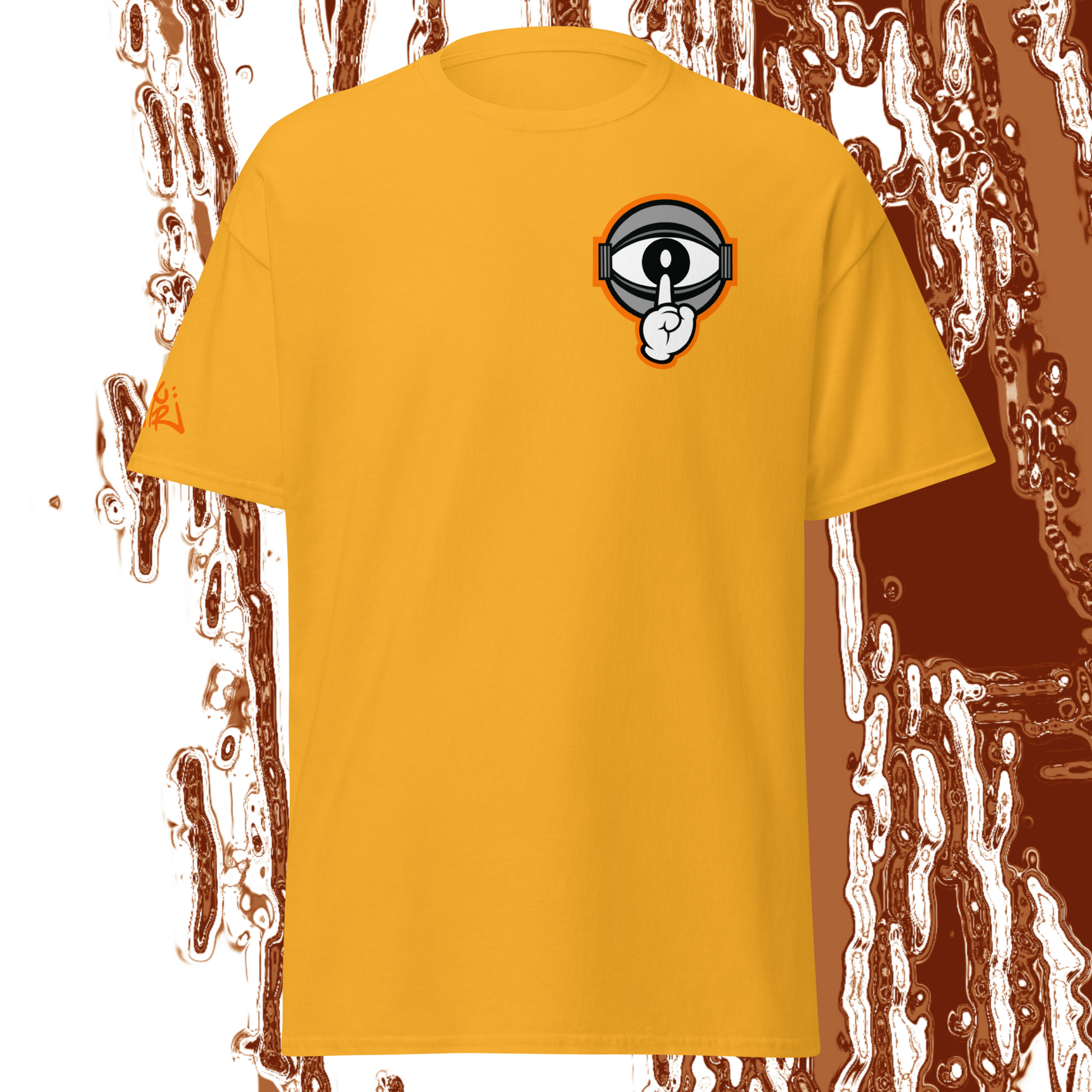 SHH! T-shirt - left chest print, right sleeve tag print and large back print.